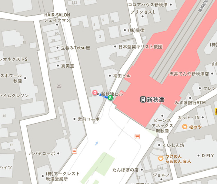 JR新秋津駅の改札口を背に、右手の券売機の先、小道を越えたビルの2Fが当サロン【福縁】です。